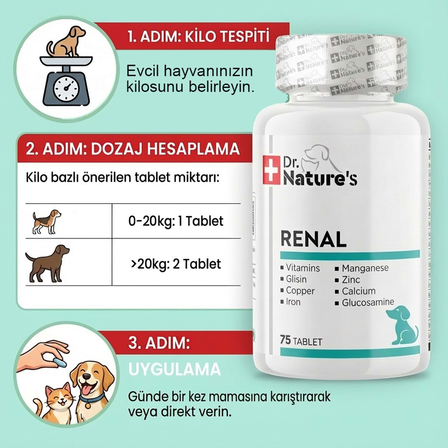 Dr. Nature’s Renal Support, köpeklerde böbrek ve genel metabolizma fonksiyonlarını desteklemek amacıyla geliştirilmiş bir multivitamin takviyesidir. Vitamin A ve D3, bağışıklık ve hücre yenilenmesini desteklerken; Vitamin C güçlü antioksidan etki sağlar. K3, B1, B2 ve B6 vitaminleri, enerji metabolizması, sinir sistemi ve protein-karbonhidrat metabolizmasının normal işleyişine katkıda bulunur. Böbrek fonksiyonlarının veteriner kontrolü eşliğinde desteklenmesi gereken durumlarda günlük kullanım için uygundur.